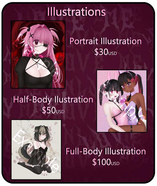 Hi, I'm Illya a self taught artist who enjoys drawing cute and horror themed illustrations. I can draw Character illustrations, Stream Overlays, Vtuber models, Emotes and more!